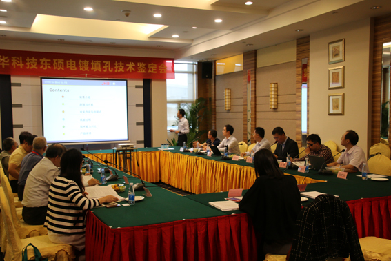 鑒定會議由林金堵教授主持,光華科技董事副總裁鄭韌先生,東碩科技楊應喜總經(jīng)理、劉彬云總監(jiān)等出席了鑒定會。會議過程中,劉彬云總監(jiān)首先介紹了東碩電鍍填孔技術,該技術屬東碩科技的創(chuàng)新自主研發(fā),于2013年1月立項,目前已成功完成產(chǎn)品的預研、小試、中試、以及客試階段測試,測試結果表明本項目研發(fā)出的新產(chǎn)品可用于盲孔的電鍍填充過程,能實現(xiàn)盲孔有效、快速的填充,且性能穩(wěn)定,值得推廣和應用。