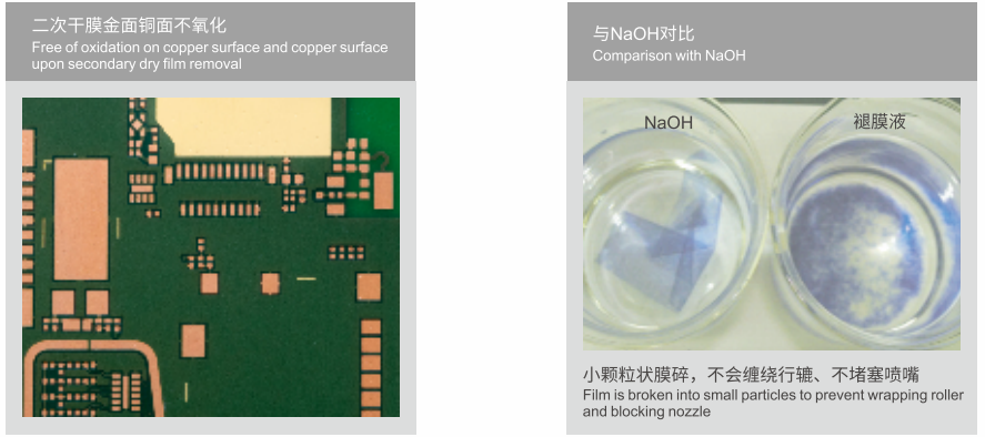 用于PCB制作中內層干膜、外層干膜和化鎳金選化干膜的褪除,特別適用于精細線路干膜的去除,可用于IC載板和MSAP制程去膜。